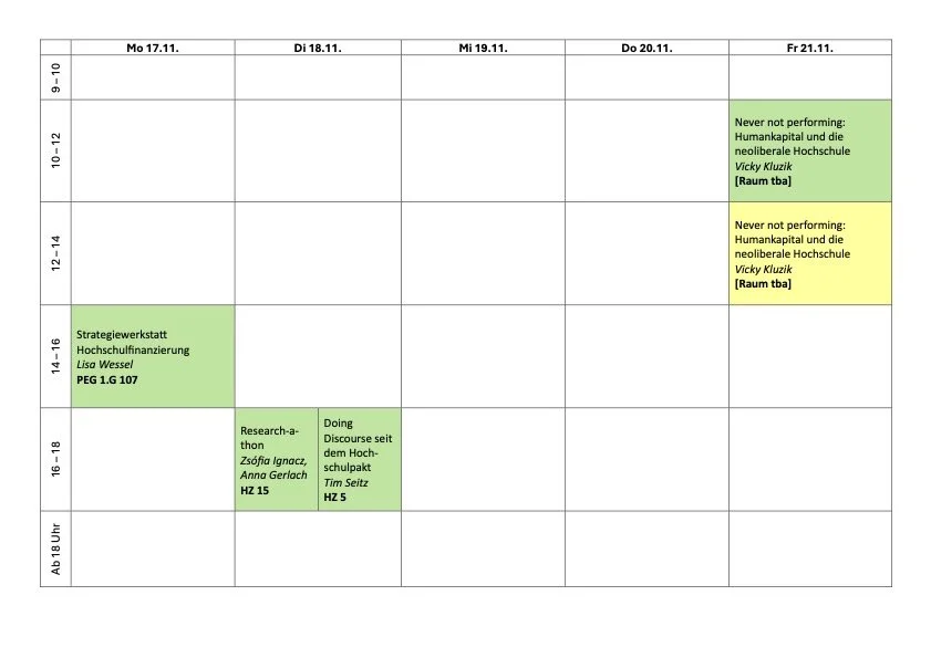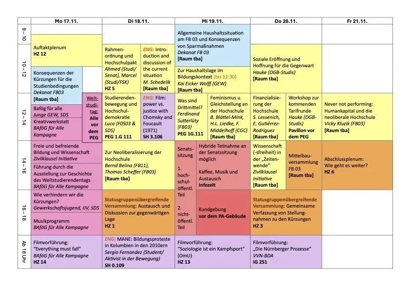 Farbschema: gelb=allgemeine Events/Plenum/Podiumsdiskussionen; blau=Infoveranstaltungen seitens Fachbereich; orange=Versammlungen spezifischer Statusgruppen; lila=kulturelle Events; grün=umgewidmete Lehrveranstaltungen, rot=Kundgebung; rosa=Weltstudierendentag.